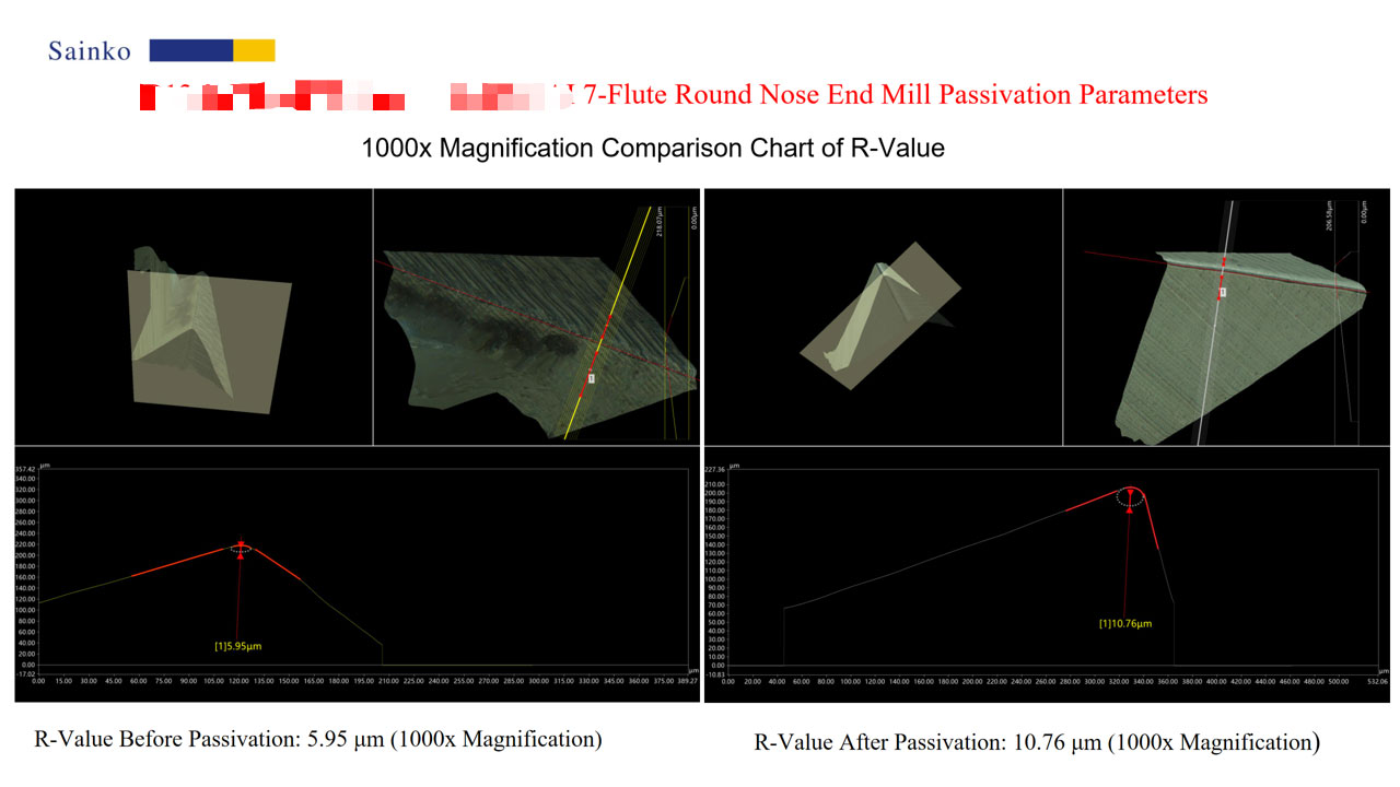 In this passivation test on 7-flute corner radius end mills, the PL-24AX machine and 15000-L abrasive were used, with a processing time of 20 seconds per tool. A total of 4 tools were passivated. Observations under a 500x microscope showed that serrations and burrs on the cutting edges were largely eliminated after passivation, which can effectively improve the surface quality of machined parts and chip evacuation performance. Measurements at 1000x magnification confirmed that the post-passivation R value stably reached 10.76μm, meeting the preset target and verifying the effectiveness and reliability of the passivation process.
